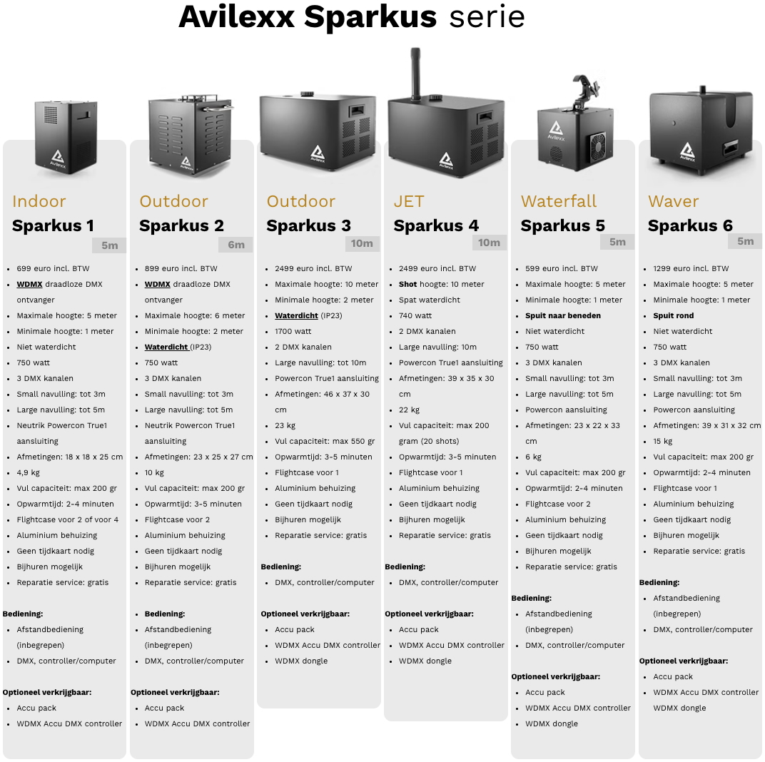 De AVILEXX SPARKUS 6 is een revolutionaire koudvuur fontein die zorgt voor een spectaculaire show, zowel indoor als outdoor. Dankzij de geavanceerde technologie produceert deze machine een indrukwekkende fontein van tot 5 meter hoog (instelbare hoogte), zonder risico op brand. Het resultaat? Een adembenemende visuele ervaring zonder de noodzaak van een vergunning. De machine is gemakkelijk te bedienen via een afstandsbediening of DMX en is de perfecte keuze voor evenementen, festivals en privéfeesten. De Sparkus 6 kan rond spuiten in een halve cirkel, graden instelbaar tot 180 graden. De Sparkus 6 kan eenvoudig draadloos worden gemaakt met de Avilexx WDMX plugs. Hiermee wordt de machine voorzien van een Wireless Solution LumenRadio DMX-ontvanger.