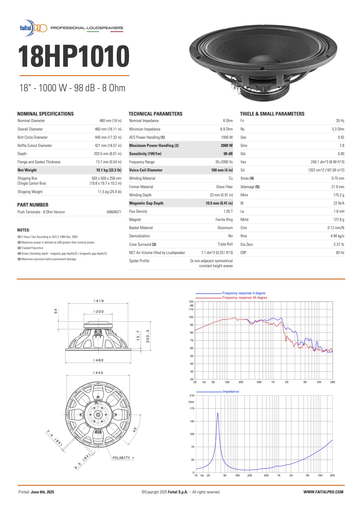 18 inch - 1000 W - 98 dB - 4 Ohm / 8 Ohm LF Driver