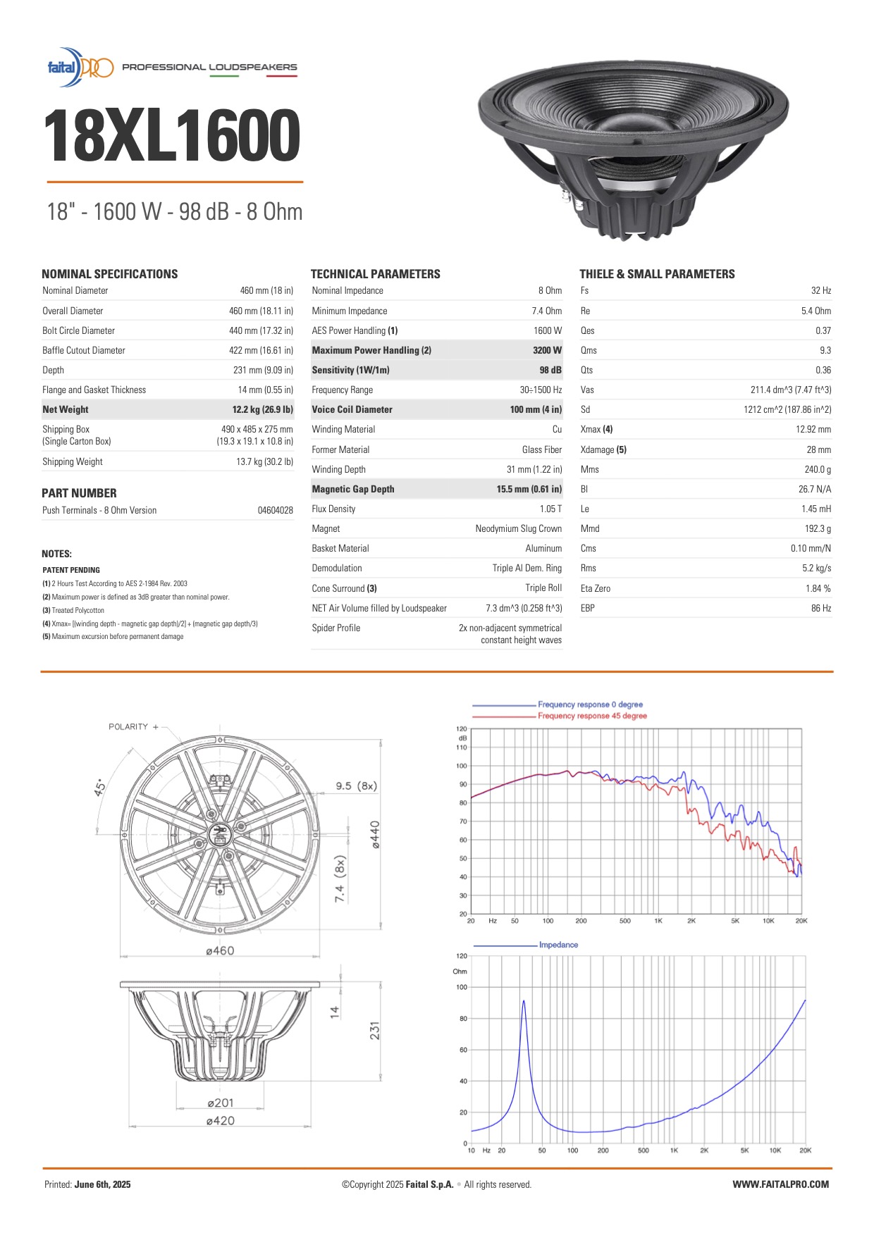 18 inch - 1600 W - 98 dB - 4 Ohm / 8 Ohm LF Driver