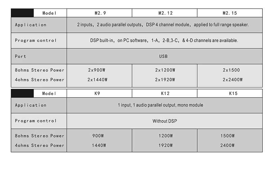 De nieuwe M-versterkermodules zijn pure Class-D eindversterkers, verkrijgbaar als 1-, 2- of 3-kanaals versterker en met een vermogen van 450–1500 Watt RMS @8 Ohm per kanaal. XLR-ingangen zijn net zo vanzelfsprekend als Speakon-uitgangen en Powercon in/uitgangen. De DSP (behalve bij de K-variant) kan zowel via het frontpaneel als via USB met een pc/laptop worden aangestuurd en bediend. Met een USB-hub kunnen zelfs meerdere versterkers via één USB-verbinding met een laptop worden bediend. De ingebouwde ventilatoren zijn temperatuurgestuurd en er is ook een oververhittingsbeveiliging aanwezig.