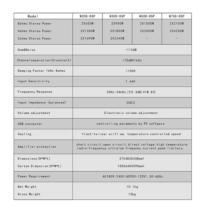 De nieuwe M-serie is een pure Class-D eindversterker, verkrijgbaar als 2- of 4-kanaals versterker en met een vermogen van 600-2100 Watt RMS per kanaal. XLR-ingangen zijn net zo vanzelfsprekend als Speakon-uitgangen. De DSP kan zowel via de voorkant als via USB met een pc/laptop worden bediend. Met een USB-hub kunnen zelfs meerdere versterkers via één USB-verbinding met de laptop worden aangestuurd. De ingebouwde ventilatoren zijn temperatuur gestuurd en er is ook een oververhittingsbeveiliging aanwezig.